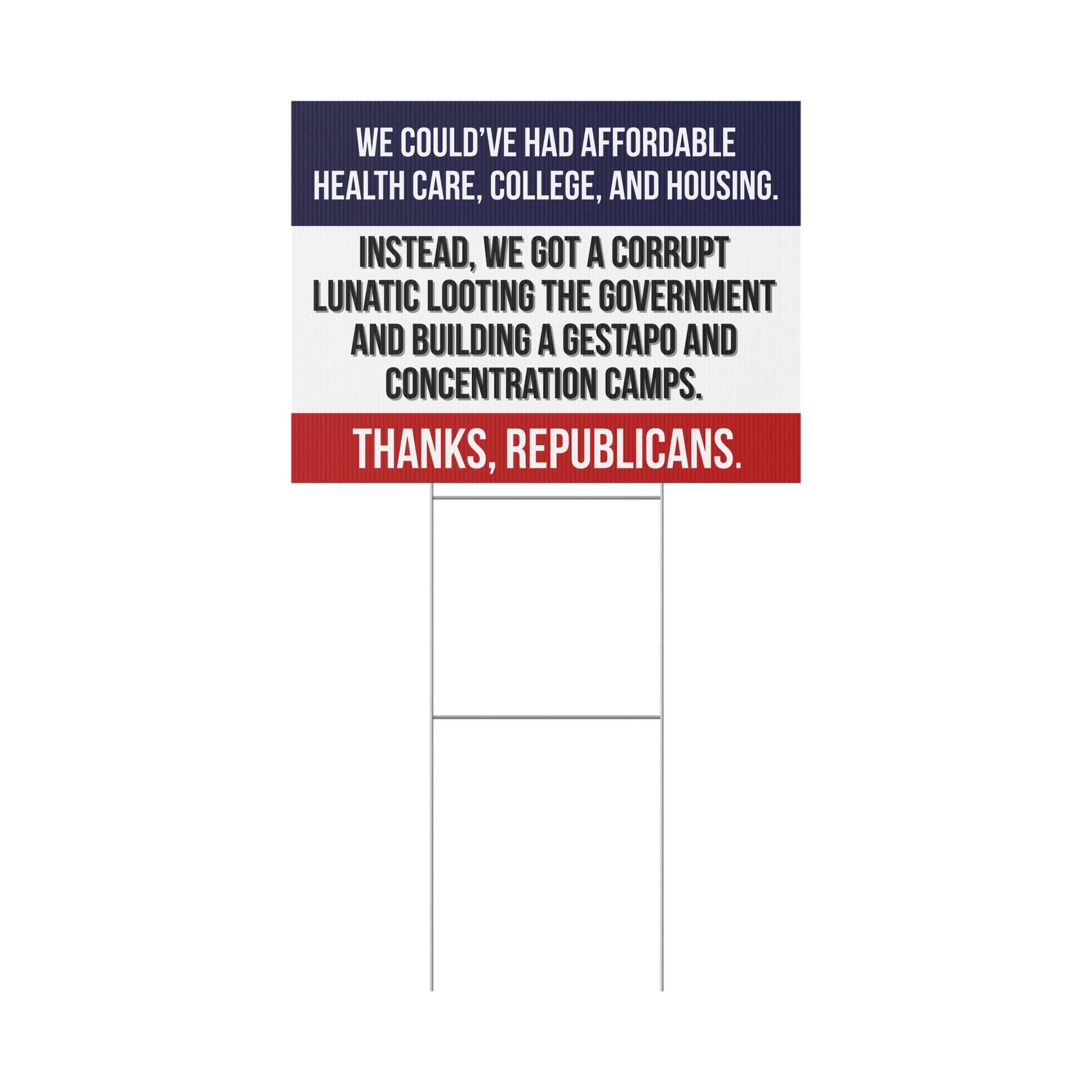 Send a bold, undeniable message with our “We could've had affordable healthcare, college and housing, Instead, we got a corrupt lunatic looting the government and building a gestapo and concentration camps. Thanks, Republicans. — the ultimate protest sign for your lawn, event, or rally. Designed to expose political deception and spark action, this double-sided, weatherproof political yard sign is built for visibility, durability, and impact.