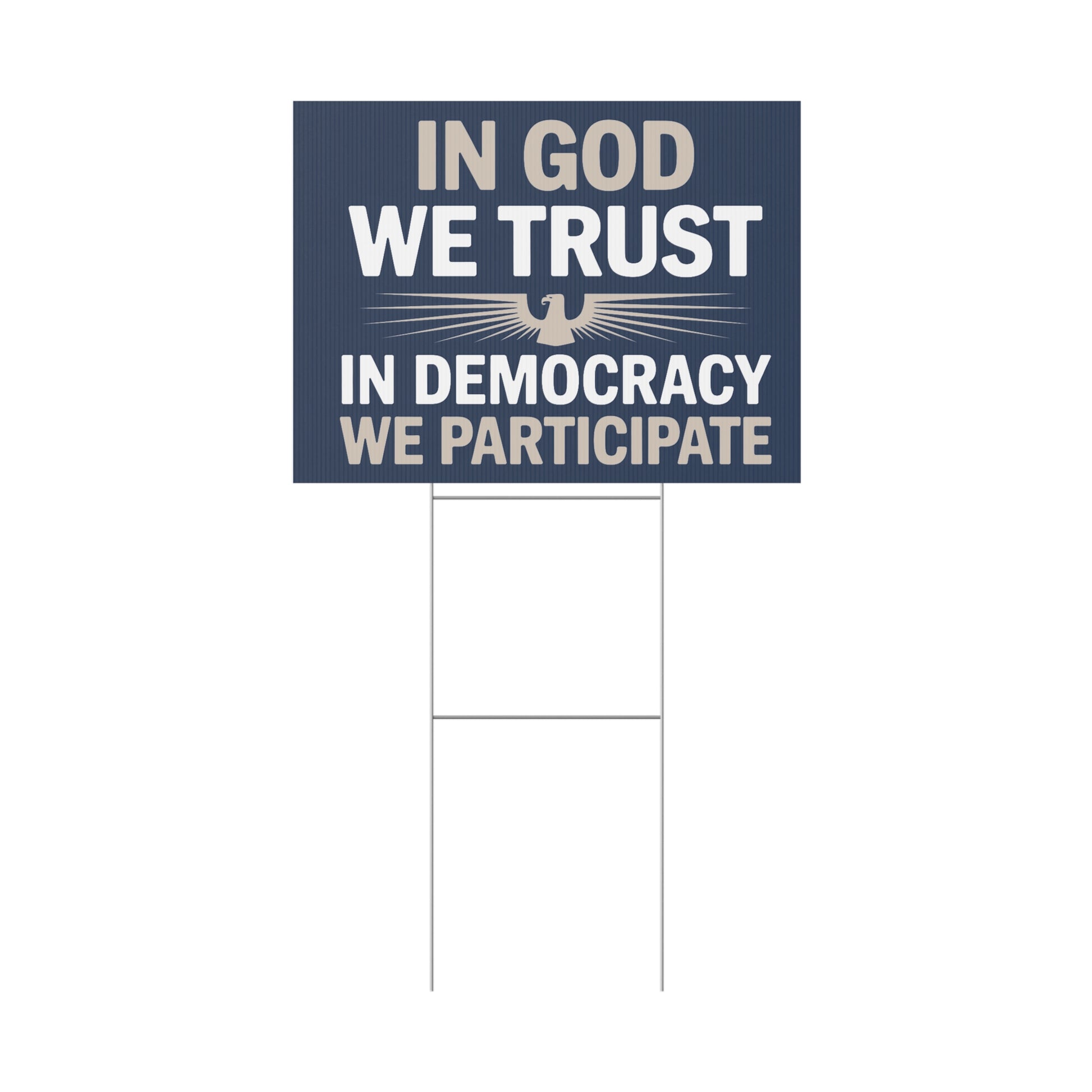 - “In God We Trust / In Democracy We Participate” — A patriotic statement of faith + action, pairing spiritual trust with civic responsibility. Because belief alone isn’t enough — we must all take part.