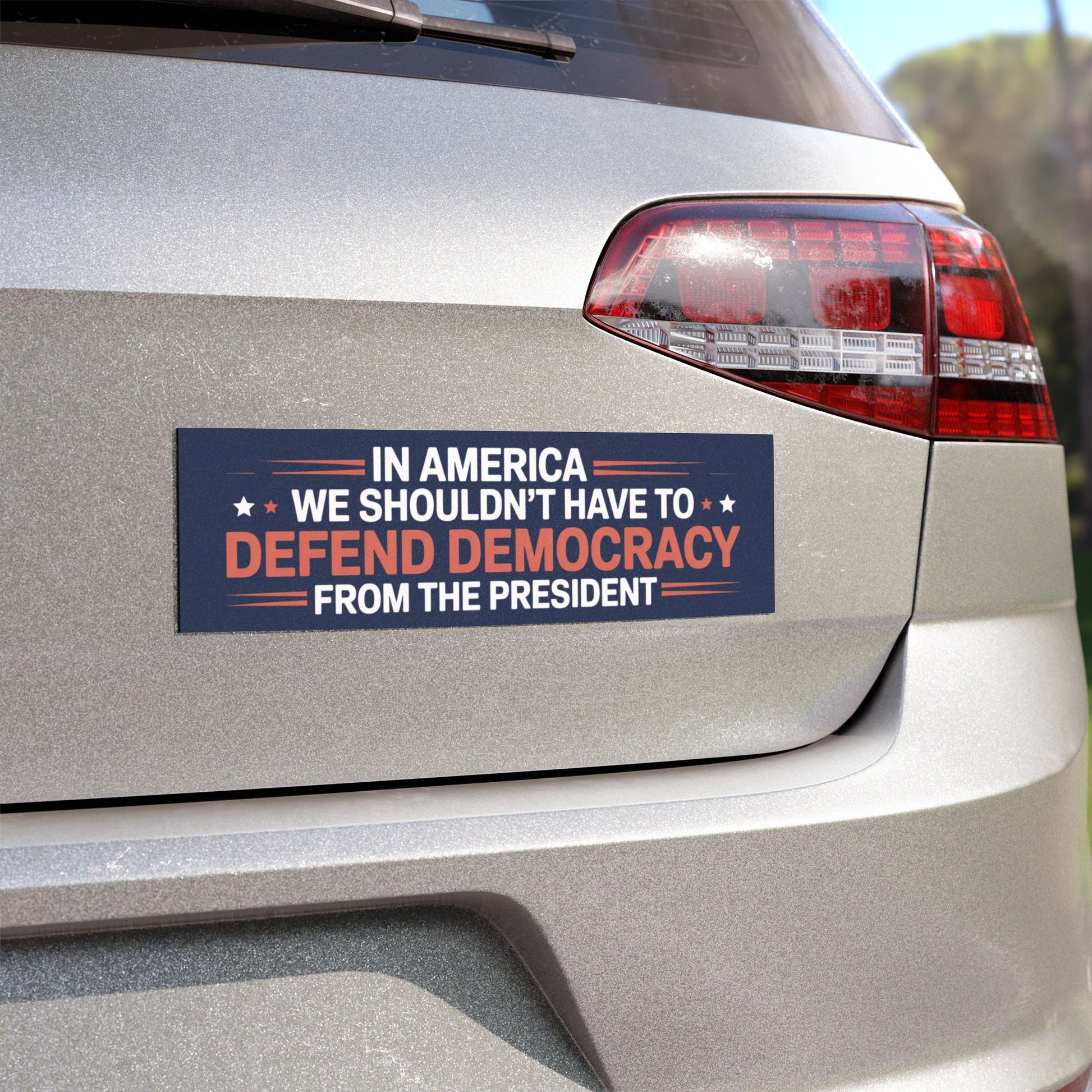 "In America, We Shouldn't Have to Defend Democracy from the President" is our custom designed message that is printed on this premium grade 10" x 3" magnet that is about the same size as a bumper sticker and can be used both indoors and outdoors. If you love the message, but worry about your vehicle getting targeted or damaged, this item is perfect, as you can take it on and off as you wish. You can also mix up your messages frequently! This graphic and message is also available as a sticker, yard sign, and banner in our store.