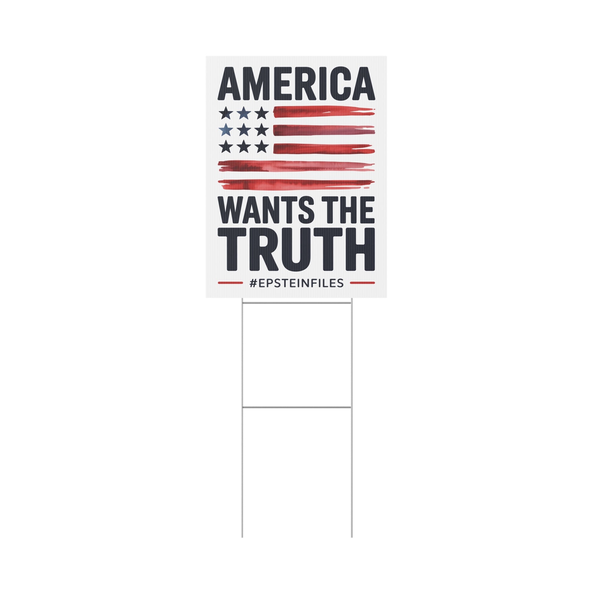 Printed on durable, weather-resistant corrugated plastic, this 18" x 24" vertical “America Wants the Truth — #TheEpsteinFiles” yard sign is built for powerful impact and long-lasting outdoor display.