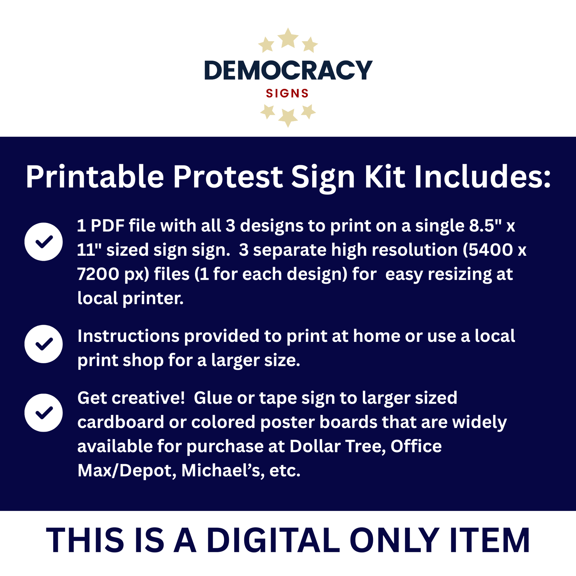 3 original protest sign designs in PDF format (8.5″ × 11″) for quick print-at-home use