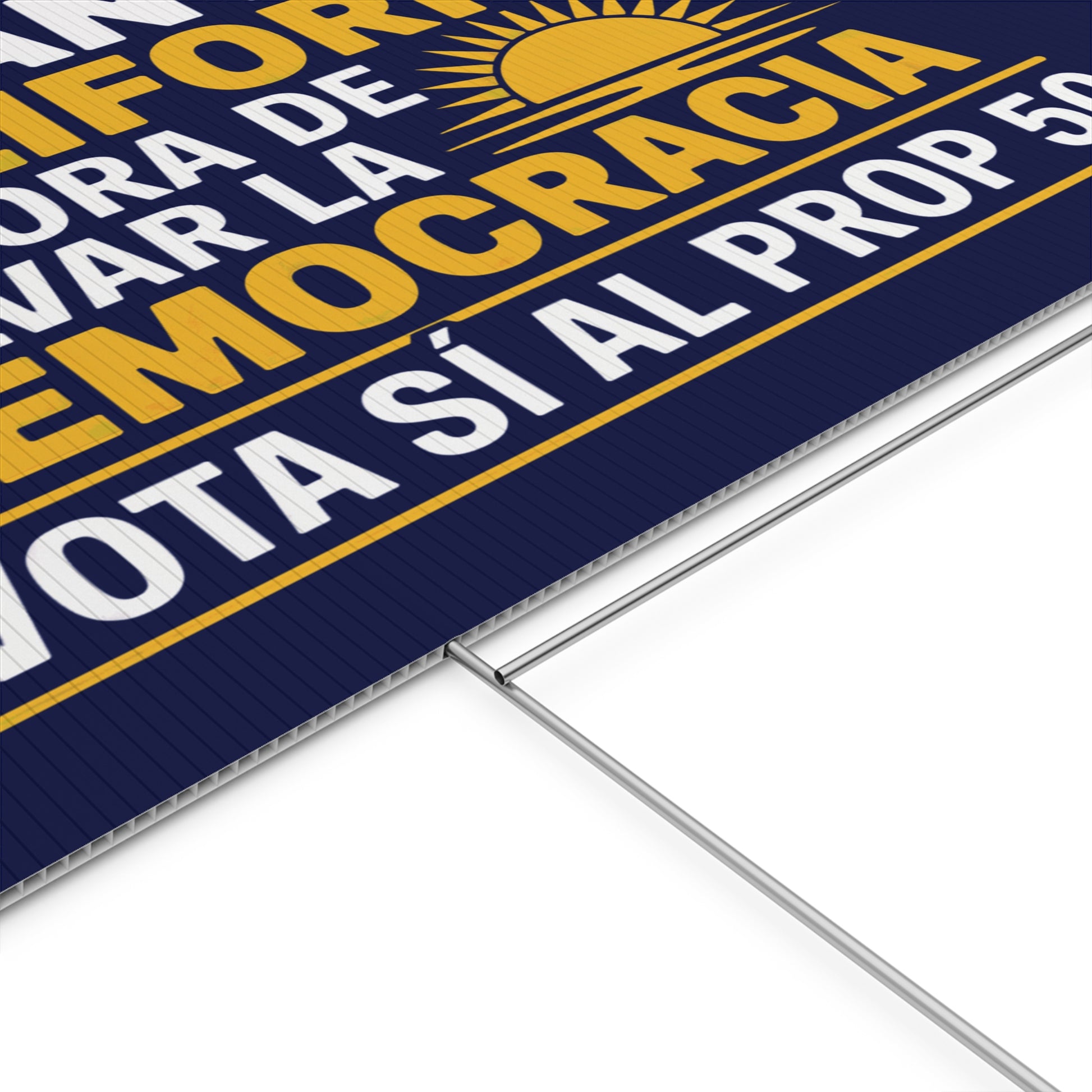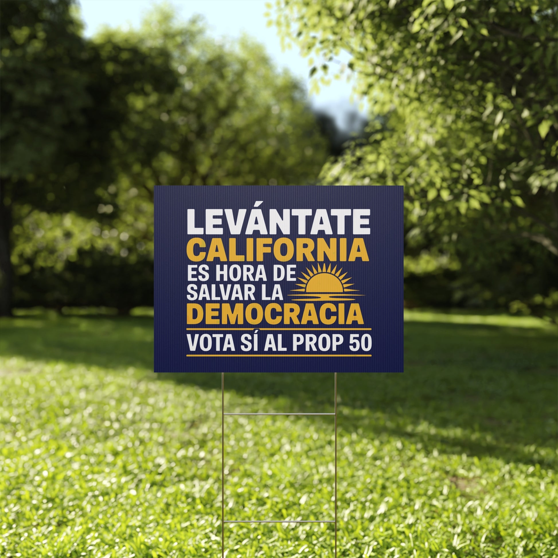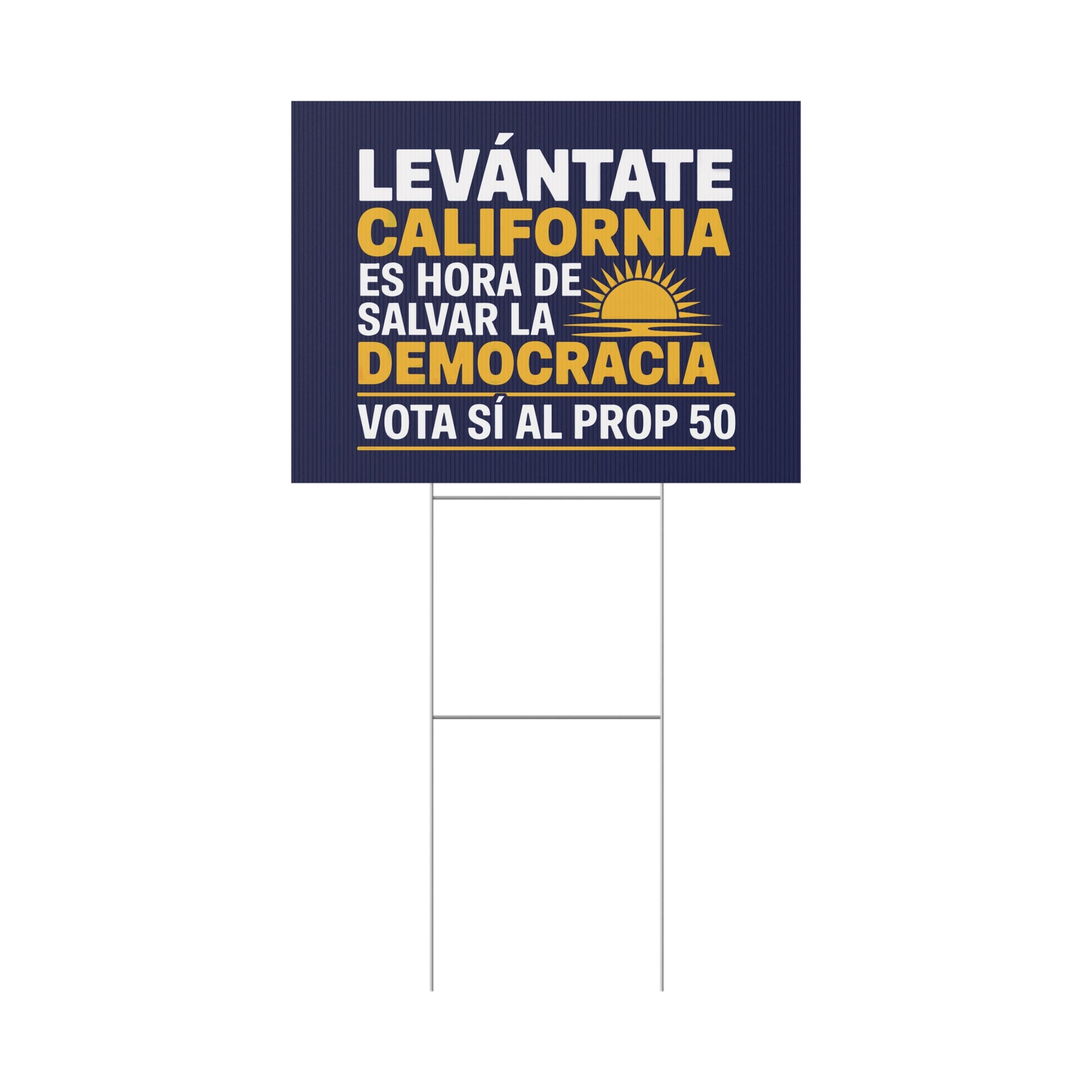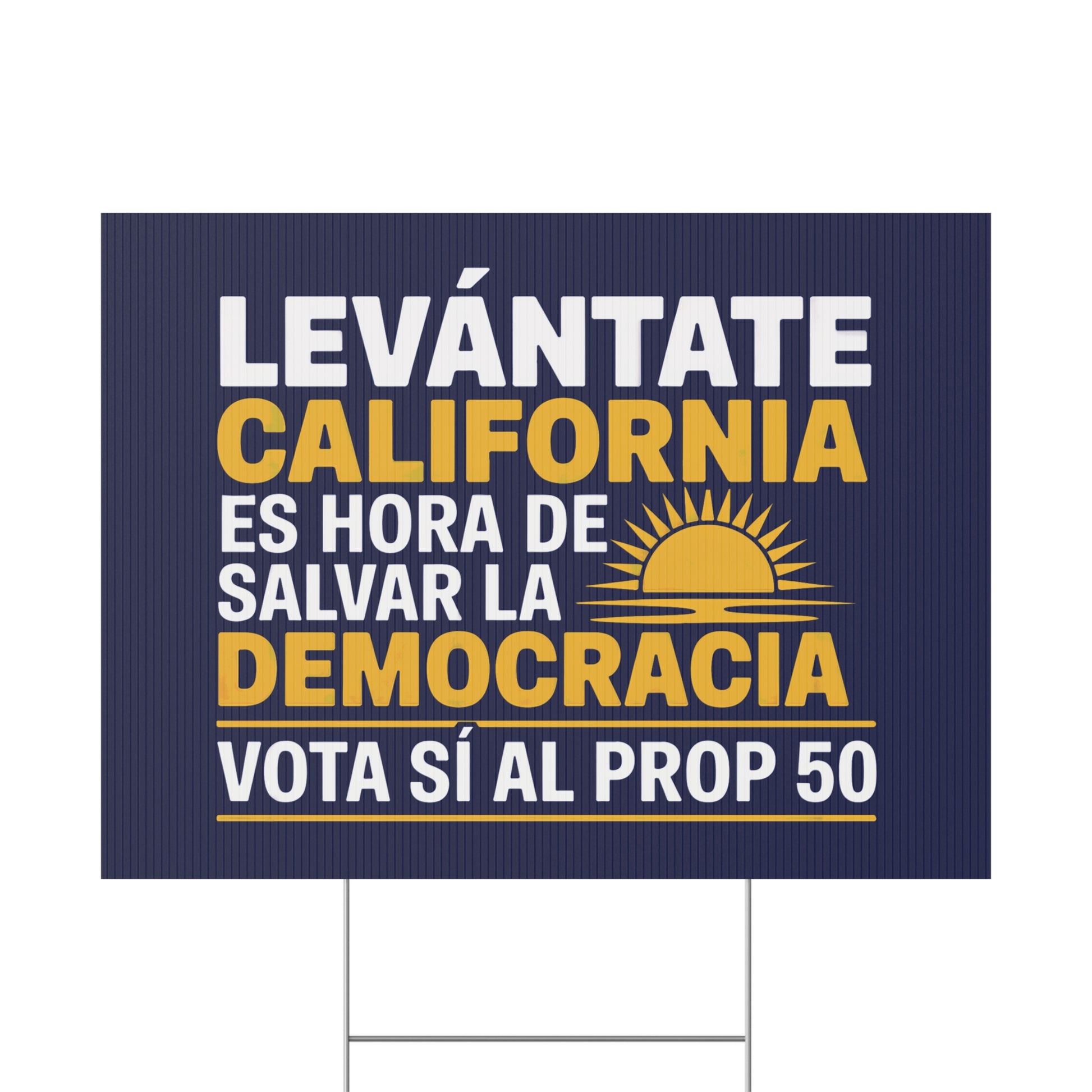 Haz que tu voz sea imposible de ignorar con nuestros llamativos letreros de 24" x 18" de Sí al Prop 50 — diseñados para luchar contra el fraude electoral y defender la democracia.