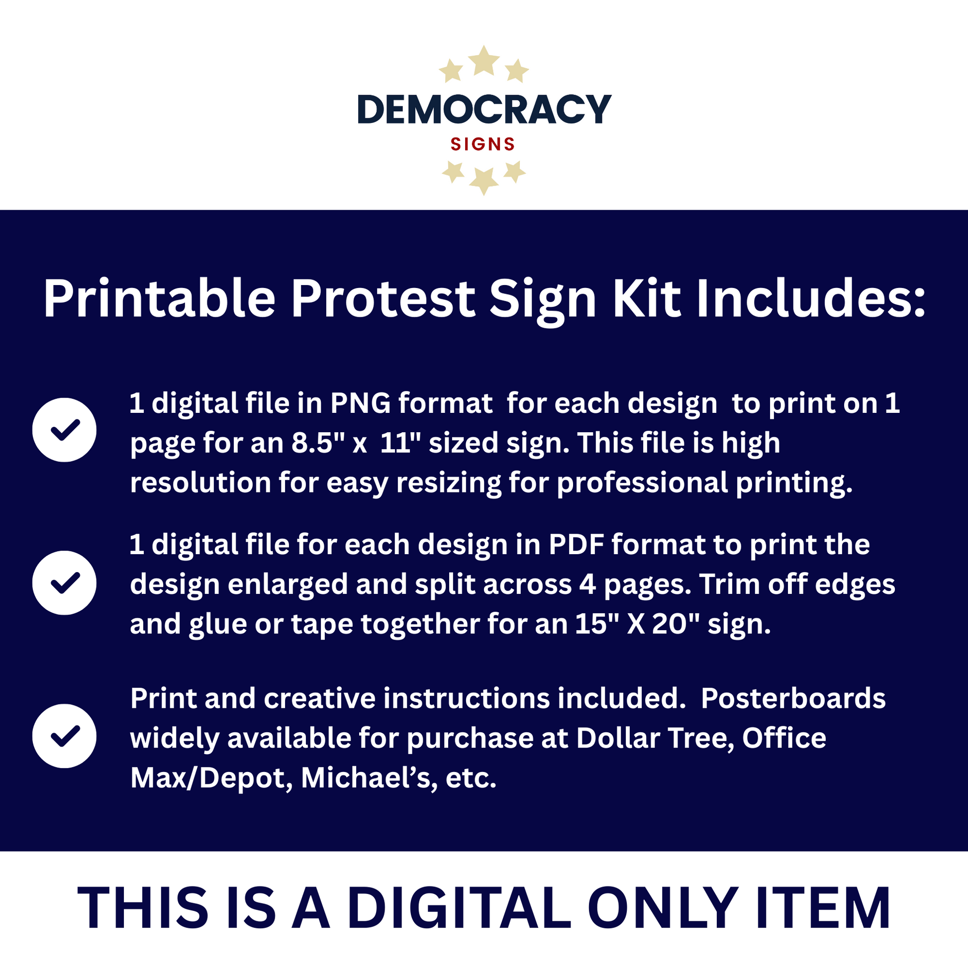 🖨️ Take your voice to the streets with this powerful digital protest sign kit! Designed for instant access and easy at-home assembly, this bundle includes 2 different size options to print from home on any standard sized paper.