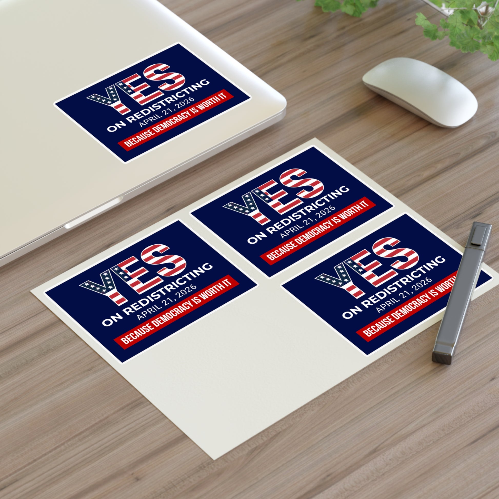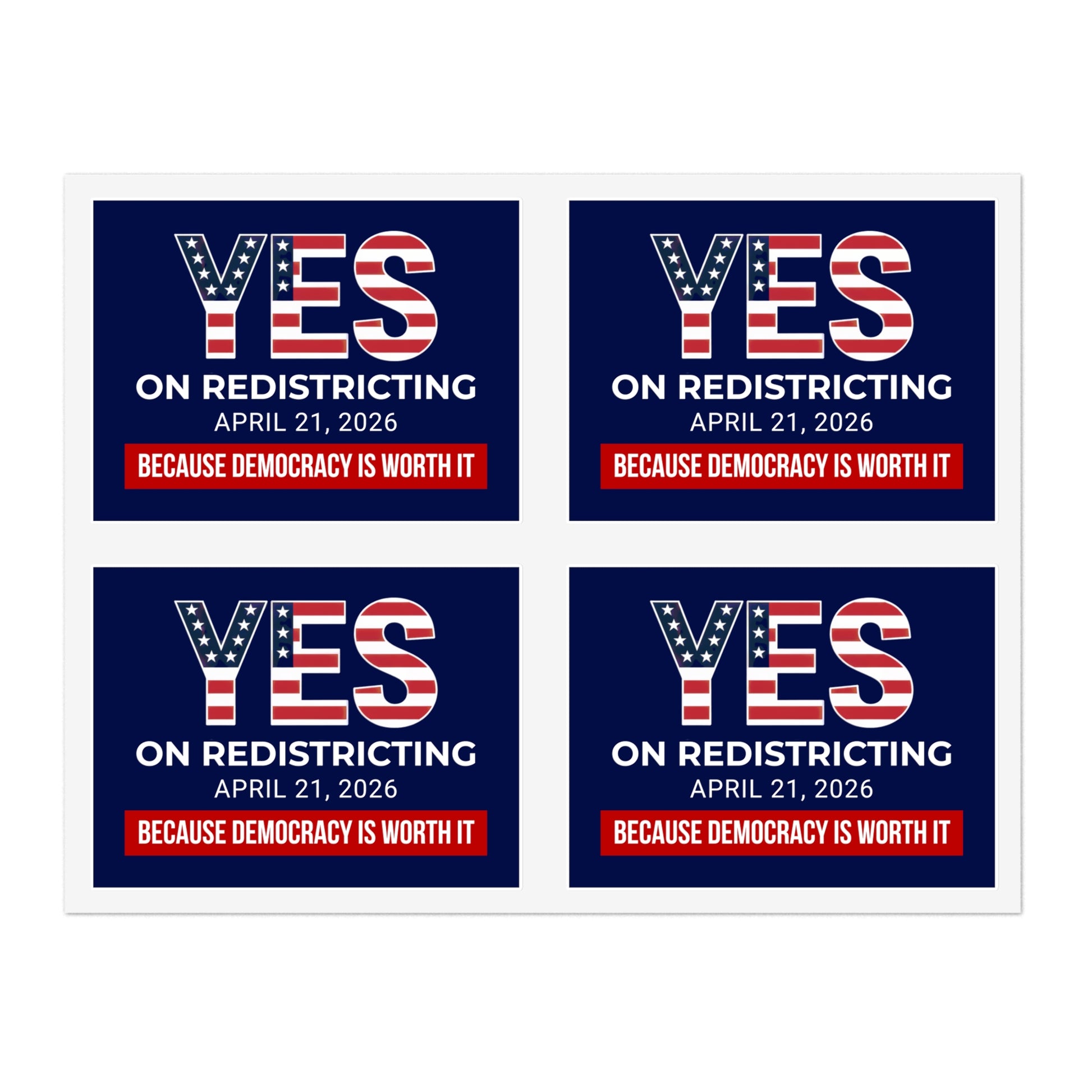 These political sticker sheets carry bold, patriotic messaging made to stand out on laptops, water bottles, mailers, and campaign packets. Each sheet holds four rectangular stickers with high-contrast typography and red, white, and blue palettes — clear statements advocating a “Yes” vote on redistricting. The stickers are printed on premium vinyl with a matte UV laminate so colors stay vivid through everyday handling and outdoor exposure.