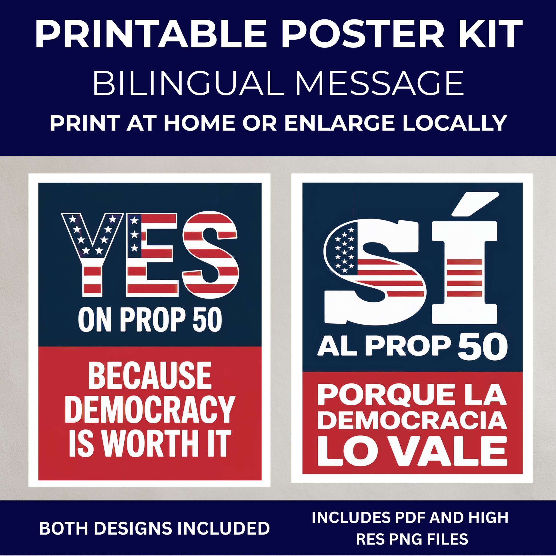 Show your support for democracy and Proposition 50 with this striking bilingual poster set — featuring matching English and Spanish designs that make your message clear to everyone in your community.
