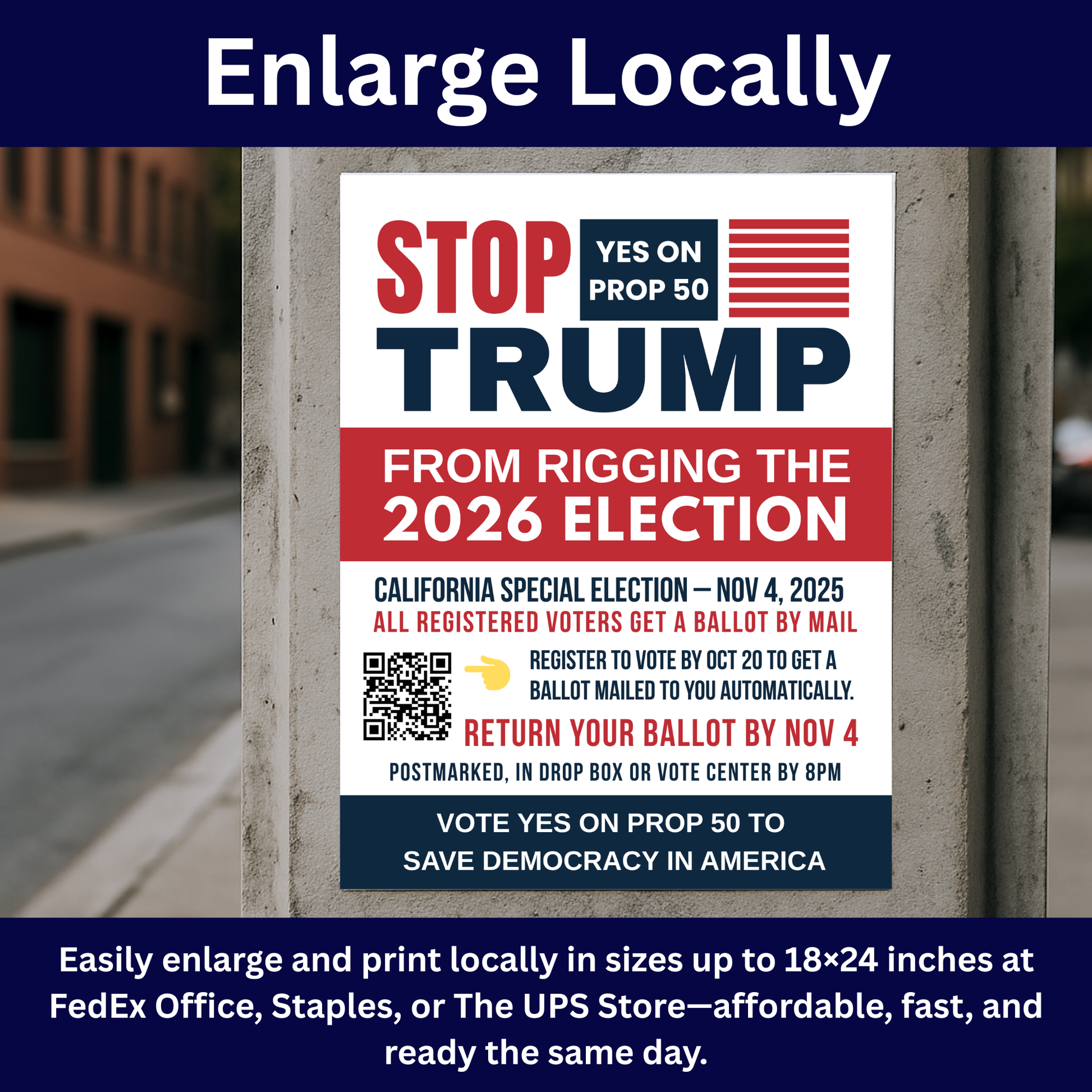 Take a stand for fair elections and democracy in 2026 with this bold bilingual poster kit. Designed in both English and Spanish, this version includes a built-in QR code linking directly to the official California voter registration site (ca.gov) — making it perfect for community outreach, tabling events, and window displays.